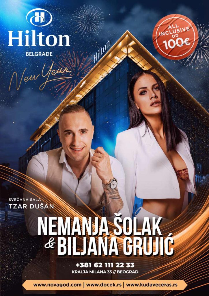 Nemanja Šolak i Biljana Grujić će se pobrinuti da Nova godina hotel Hilton Beograd bude magično, nezaboravno iskustvo, ispunjeno najlepšim trenucima, najvećim hitovima i novogodišnjom čarolijom! Publika je dobro upoznata sa njihovim spektakularnim nastupima, sjajnim vokalima i harizmatičnom scenskom energijom, koja svaku pesmu pretvara u pravi muzički doživljaj i garantuje atmosferu za pamćenje.