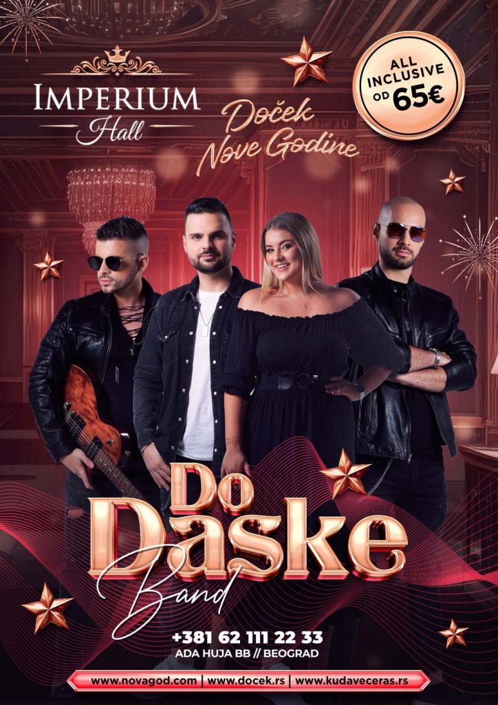 Doček Nove godine u Imperium Hall-u nudi vam luksuzno iskustvo koje ne smete propustiti. Sa cenom od 65€, uživajte u svečanoj večeri koja će zadovoljiti i najizbirljivije gurmane. Naš bend Do daske će vas zabavljati tokom cele noći, stvarajući savršenu atmosferu za proslavu.